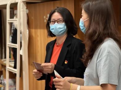 在三舍B中,中秋时节的慰问活动如火如荼地进行着。伴随着逐渐浓厚的节日氛围,马老师、春亮老师、李老师、荆老师为物院的同学们送上了香甜的月饼,同时贴心询问同学们生活起居的适应问题。马老师随和而亲切地与诸位新生交谈拉家常,而东师的风土人情也得到来自五湖四海的新生的纷纷赞扬与肯定。“明天记得与家人联系。“马老师的嘱托让远在他乡的物院学子们更为心生暖意。春亮老师也亲切地向同学们介绍,并欢迎同学们就学业方面来询问问题。