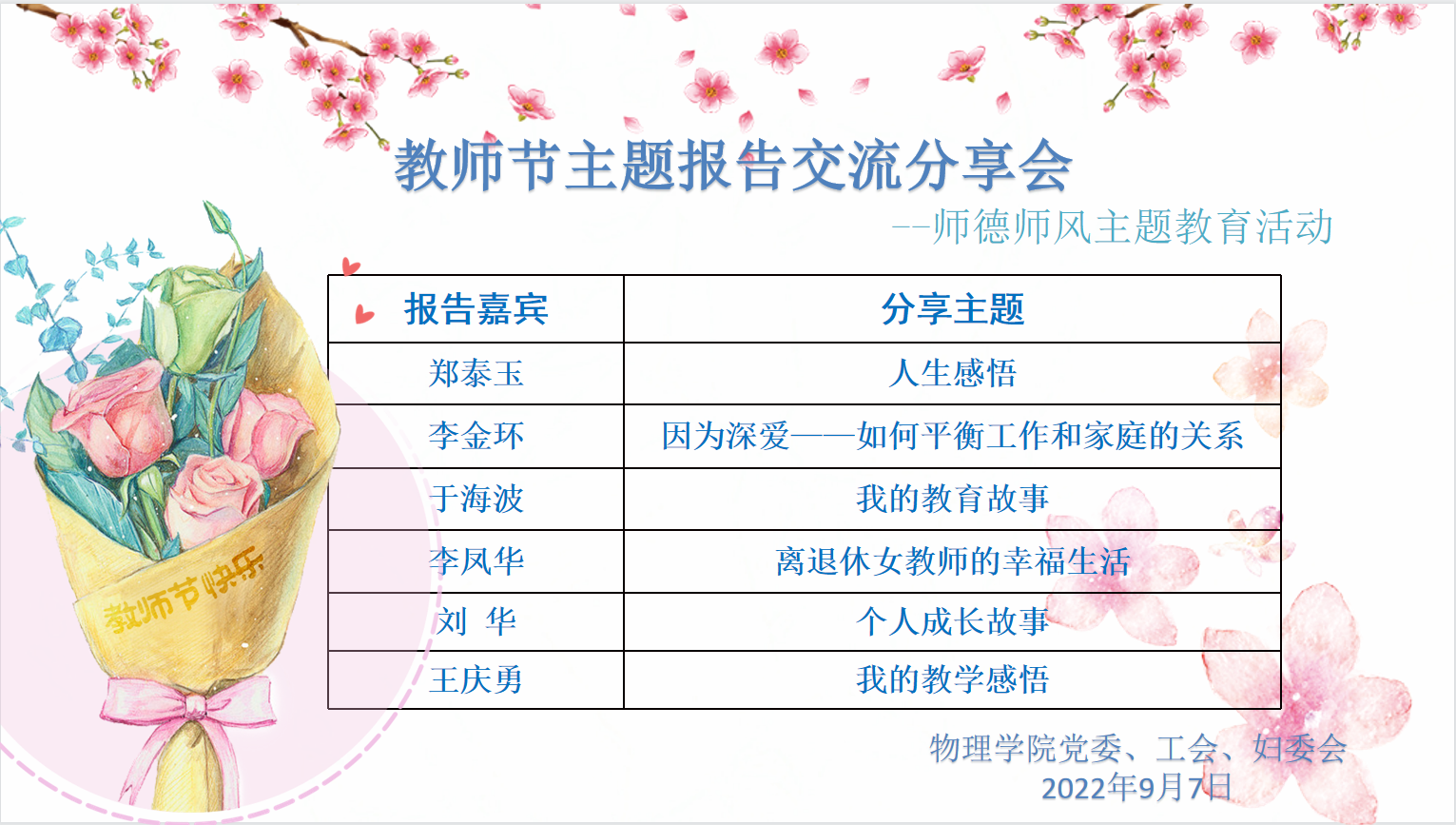 随后,郑泰玉、李金环、于海波、李凤华、刘华和王庆勇做了主题交流分享。郑泰玉老师分享了她的“人生感悟”,她告诉我们,一定要坚定信念,保持乐观向上的心态,特别是在遇到困难时,要有越过难关的勇气,在平时工作中要注重积累、厚积薄发,同时还要时刻保持宽容、快乐和感恩之心。李金环老师通过自己的成长经历深刻诠释了教师职业深层次的意义,感恩家人的支持,她的执着和坚持给年轻老师带来启发,有梦想才有远方。于海波老师从我的家乡、我的小学开始,用一个个生动的人生故事,解读了什么是正确的教学方法。李凤华老师分享了丰富的晚年生活,同时介绍学院有更多的老同志仍然在发挥着余热、贡献着力量,让大家感受到退休后的幸福生活,向往而不惧怕。刘华老师从家境贫寒到大学的选择,从对物理专业的理解到发现兴趣,找到心流的状态,那就是热爱,告诉我们理想与完美的工作条件要靠自己争取。王庆勇老师讲解了他对教学的认识、教学理念、教学研究与课程建设,解读了他对教师职责的深刻理解。六位老师的交流与分享,让大家受益匪浅,收获颇丰。