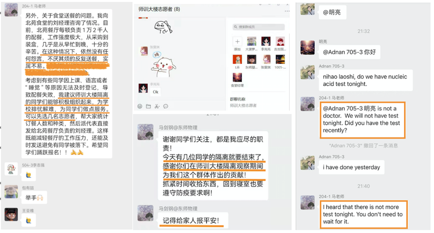 在全校抗疫一盘棋的大背景下,每天要为万余人服务的师生团队已经作出最大的努力。如何更好地照顾好隔离区的同学们开展隔离区的自治工作势在必行。在马老师的建议下,志愿行动即刻提上日程,短短的十几分钟,志愿者小队就组建完毕;统计用餐、排忧解难、传递正能量。人在哪里,哪里就是战场;在隔离区也要为东师抗疫做贡献。工作效果立竿见影,为工作人员提供了最精准的数据支撑。
