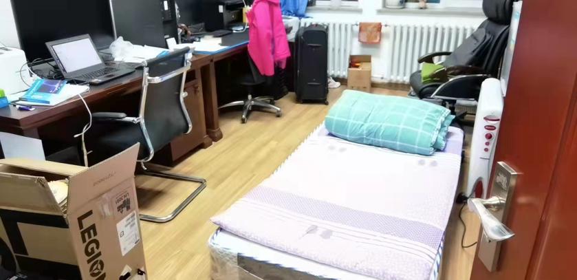 3月11日,学校发布校园封闭管理通知,由于两校区办学,学院在净月校区也需要一位辅导员入校守护学院在净月校区学习生活的60余名学生。由于原来的辅导员沈宏志老师按照防疫要求,需要居家隔离,无法入校工作,一时间入校辅导员的人选成为了紧迫问题。于老师作为入职不久的新教师,得知此事后,主动请缨,连夜带着行李搬进了办公室,搭起简单的床铺,开启了校园战疫生活。