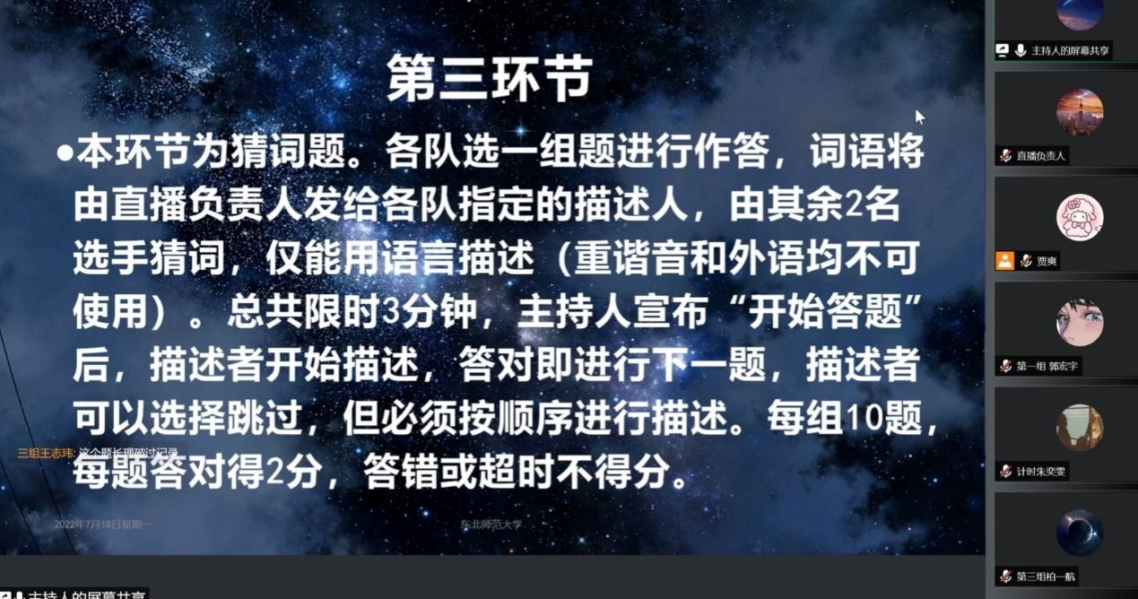 比赛历时两个小时,近百名观众通过比赛会场及线上直播的方式参与了此次比赛。比赛中,每位选手都表现出了不俗的天文知识储备,各小组成员通力合作,为观众呈现了一场精彩的天文知识竞赛。经过激烈角逐,罗浩宇、戴志鑫、郭宏宇组成的团队荣获团体一等奖,东北师范大学戴志鑫同学获得最佳选手奖。