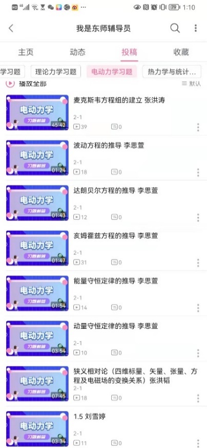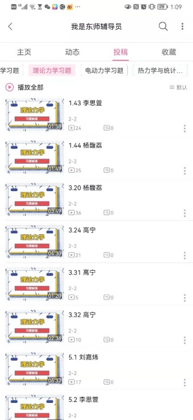 2019级的同学们建立了物院2019级专业课学习冬令营学习群和学习小组,并创建了“我是东师辅导员”b站学习平台,通过合集的形式将同学们录制的“四大力学”重难题型讲解视频分类上传到b站账号上,以便大家学习交流,目前已上传视频讲解作品118个,受到同学们的广泛关注和好评。