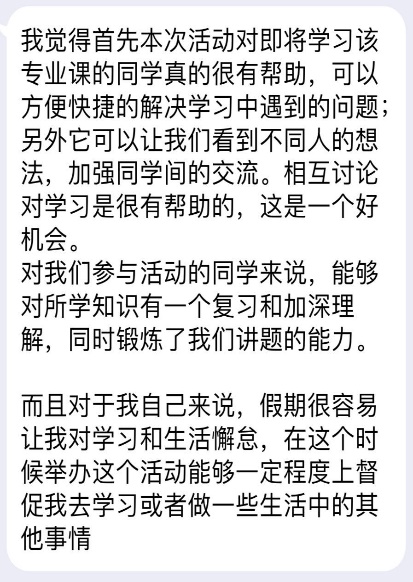 本次活动一经发起便受到了同学们的广泛好评和积极响应。漫长的寒假容易使人懈怠,通过本次活动,大家即使身处家中,亦能感受到浓厚的学习氛围,做到温故知新,重点突破。本次学风建设活动不仅能帮助同学们解惑补缺,还能锻炼讲课者的教学水平,提升大家的教师技能,可谓一举多得。