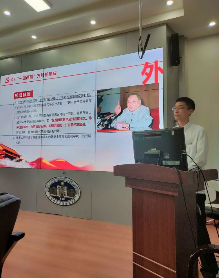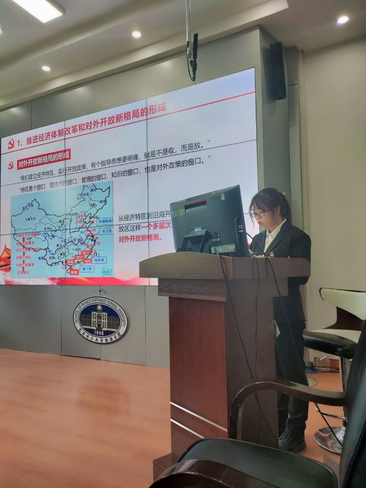 随着“星辰大海”MV的播放,拉开了本次会议的序幕。李佳琦同学带领大家领略深圳改革开放四十余年的风采,聚焦到影响深圳发展的决定性会议十一届三中全会上,讲解了中国如何完成拨乱反正的任务,并且进行改革开放的起步的伟大历程;夏洁冰同学对于“一国两制”方针以及外交方针等进行了深度解读;易淼淼同学针对党的十二大、十三大以及国防战略的调整进行了详细介绍,并且带领大家感受“南方谈话”的精神,续写“春天的故事”。