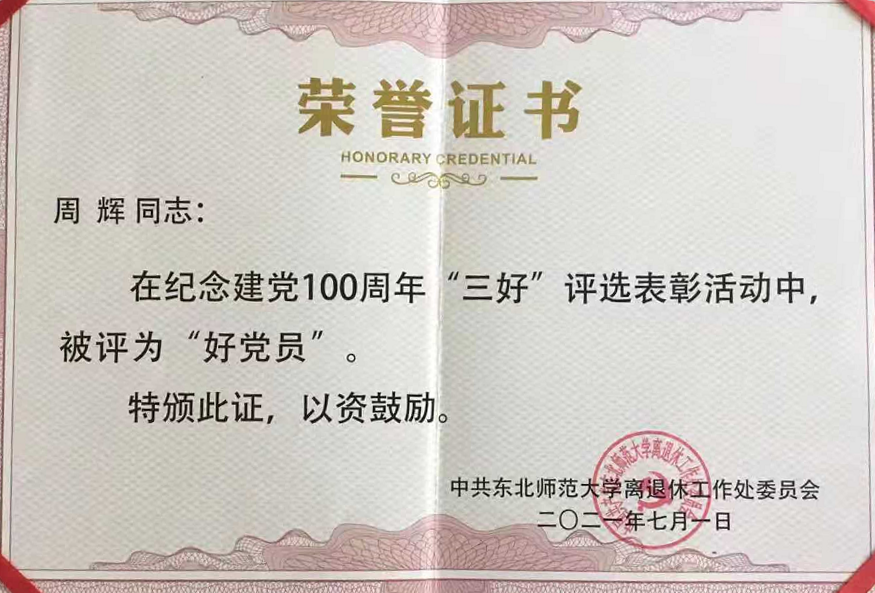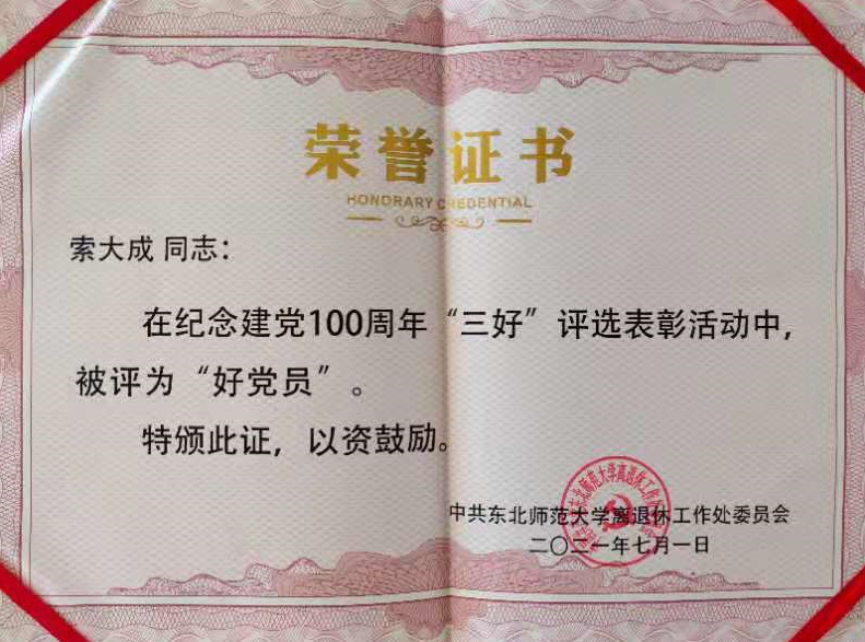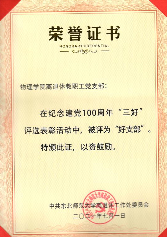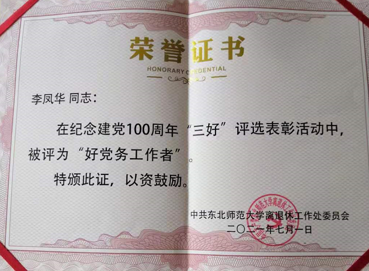 2021年6月,学校离退休处工作委员会进行了“好支部”、“好党务工作者”和“好党员”评选工作,学院离退休党支部荣获“好支部”荣誉称号,李凤华被评为“好党务工作者”,周辉老师和索大成老师荣获“好党员”荣誉称号。
