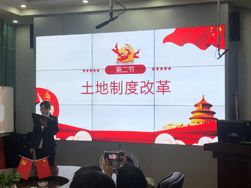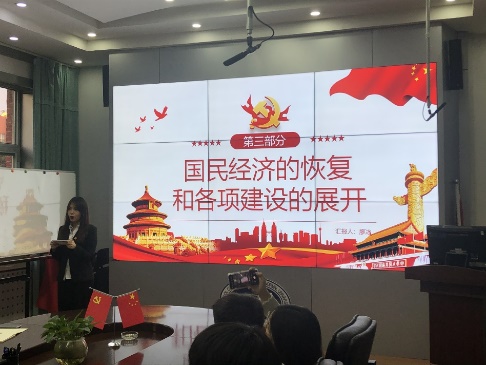 本次活动以《中国共产党简史》第五章《中华人民共和国成立和社会主义过渡》为主体,分为5个板块进行讲解,详细展示了新中国成立以后所面临的各项困难以及中国共产党在这段时期取得的各项成就。最后,荆鹏老师对于此次活动给予肯定,并从多方面提出思考以帮助同学们全面理解党史,希望同学们能够不忘初心,牢记使命,做到知党、爱党、信党。