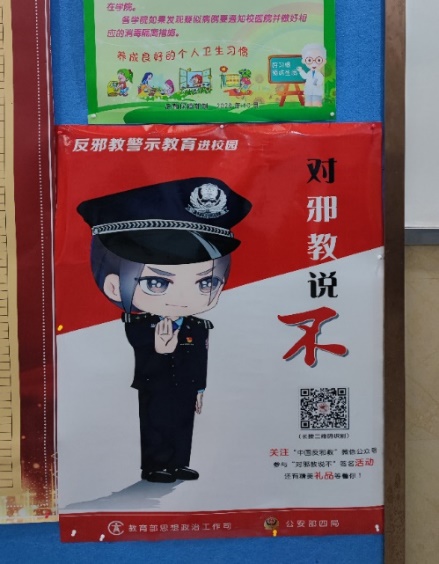 学院大厅张贴海报宣传“对邪教说不”。各年级辅导员引导学生关注“中国反邪教”官网和微信公众号,积极参与线上警示教育项目。