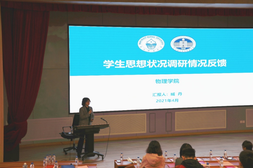 会议由党委副书记臧丹进行汇报。她首先阐述了开展学生思想情况调研工作,目的在于了解学生实际情况与真实需求,有助于各位老师更好的了解当前学生的思想状态。随后,她根据2020年秋季学期的本、研思想动态调研结果,分别针对本、研学生的政治觉悟、思想水平、道德品质、文化素养、宗教观念、学习科研、人际交往、经济水平、社会实践、生活休闲、身心健康共计11个方面的整体情况进行说明。针对本次调研中发现学生的突出问题,臧丹老师结合学院实际工作情况,提出行之有效的应对举措,助力学生的全面成长成才。