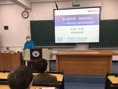 随后,洪霞教授做了题为《线上教与学,师生同成长——混合式线上教学模式初探》的报告,分享了线上教学方式的选择、混合式线上教学实践、线上教学的经验与反思。