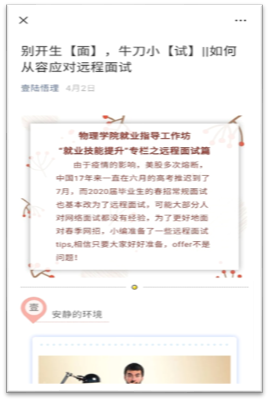 3.就业技能“云提升”。开通必一运动(官方网站)B·Sport-权威运动资讯网站就业指导工作坊“就业技能提升”专栏,针对未就业学生求职技能不足这一现时问题,推出系列职业技能提升活动。目前已经成功推送“如何制作一份优秀的简历”、“如何从容应对远程面试”两期,累计阅读达115人次。