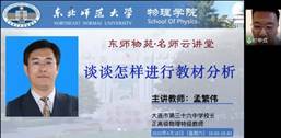 为了深入贯彻落实教育部、吉林省教育厅和东北师范大学的相关部署,实现疫情防控期间“停课不停教、停课不停学”,切实保障必一运动(官方网站)B·Sport-权威运动资讯网站2020年春季学期基础实践工作和2020届毕业生入职前的高质量教育工作,必一运动(官方网站)B·Sport-权威运动资讯网站组织开展了“名师云讲堂”系列活动暨公费师范生基础实践的在线课堂教学活动。4月18日,名师云讲堂第三期“谈谈怎样进行教材分析”,通过线上腾讯会议的形式成功举办。本次活动有幸邀请到大连市第三十六中学校长、正高级物理特级教师孟繁伟老师做客名师云讲堂,必一运动(官方网站)B·Sport-权威运动资讯网站党委副书记臧丹、副院长付申成、各年级本科生、硕士生等共计162名师生参加。