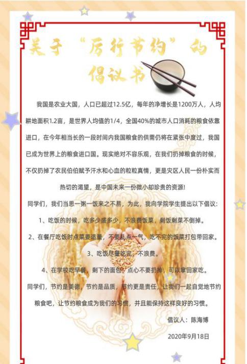 签署“厉行节约”倡议书。首先,由团总支书陈海博设计撰写倡议书,于9月18日早间上传至年级群,并发布倡议公告。各学科负责人以走寝的形式,在倡议书的封面上搜集大家的签名。