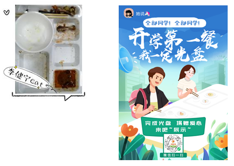 光盘打卡行动。内容一:通过扫描年级群中的“光盘打卡”海报进入小程序,或者在微信小程序搜索“光盘打卡”,扫描自己的餐盘进行打卡,积累打卡次数可参与该平台抽奖。内容二:上传自己的空盘照片给团总支书,由团总支书整理汇总,制作光荣榜照片墙,给大家颁发订制奖状。