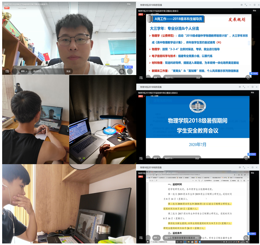 首先,辅导员对2020年上半年所承担工作进行了述职,并对大三学年的年级发展目标及相关工作安排进行了部署。然后,会议进行了暑假期间学生安全教育,辅导员从个人健康防护、防范电信诈骗、交通安全、预防溺水等4个方面进行了讲解。最后,辅导员就8月15日2018级学生返校工作进行了相关说明和安排,传达了学校在疫情防控常态化背景下的规章制度,也从学生角度调研学生普遍遇到的困难和需求,第一时间向学院进行整理汇报。