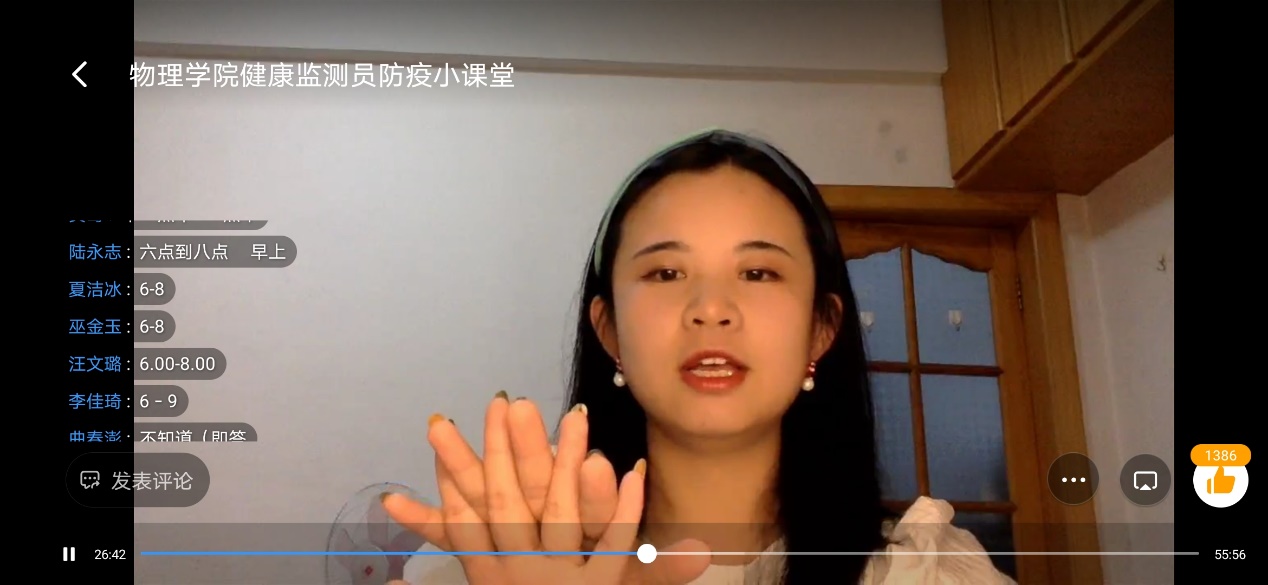 培训主要分两部分内容。首先,刘雨婷老师面向健康监测员进行防疫常识的讲解,包括新冠肺炎的科普知识、校内疫情的上报与诊疗、如何做好自我防护和日常生活行为规范,同时在线上进行了“六步洗手法”“均衡饮食”“日常管理”“疫情上报”等方面的培训。随后,在线上进行了相关问题的答疑和互动,并要求所有健康监测员将相关防疫知识传递给寝室同学。