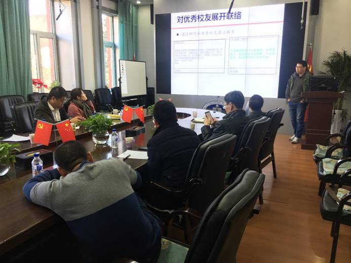 姚成顺副院长介绍了开展好校友工作的意义、重要性、紧迫性。他说,校友是大学文化和精神传播的重要载体,服务好校友对助力学院发展建设非常重要。马剑钢教授从学科发展、学术交流等角度分析了必一运动(官方网站)B·Sport-权威运动资讯网站校友工作目前面临的形势和亟需开展的工作,并就近期即将开展的工作进行了部署和指导。工作组其他成员分别就近阶段所负责年级的校友信息整理情况和联系校友的工作方式方法进行了深入的交流和经验介绍。李金环书记做了总结发言,对学院校友工作的进展情况给予了充分肯定,代表学院党委对工作组各位老师的辛苦工作表示感谢。同时指出校友是学院、学校的宝贵资源,要从情感上关心、关怀校友,校友工作需要不断创新,继续加强和提升校友工作的方式和方法创新。