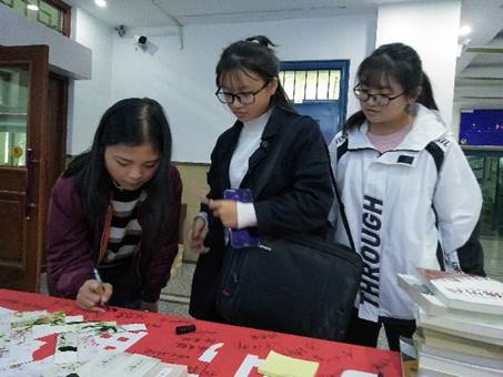 本次活动中,参与者每捐赠一本书,均可获得特色书签一枚,并在条幅上留下自己的名字,同时捐书的同学可以在便利贴上写下自己阅读感悟及寄语,并贴在书籍中。本次活动共捐得书籍50余本,充分发挥了闲置书籍的作用。