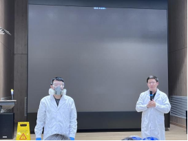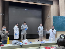 刘存老师以生动活泼的互动以及严谨准确的专业知识,向同学们介绍了防毒面罩,手套佩戴细节与注意事项,同时邀请同学一同参与防护服穿戴,并强调其在紧急情况下的重要作用。同学们认真学习并积极参与演示,亲身体验并学习到了实用的实验室应急处置技能。