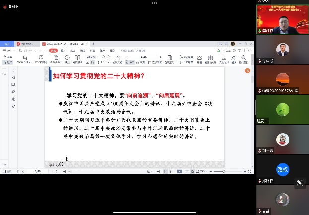 为深入学习宣传贯彻党的二十大精神,12月28日下午,必一运动(官方网站)B·Sport-权威运动资讯网站党委在线上举办学习党的二十大精神宣讲报告会,报告会邀请学校学习贯彻党的二十大精神宣讲团成员、政法学院院长李红权教授作题为《自我革命:中国共产党跳出历史周期率的第二个答案》专题报告。报告会由必一运动(官方网站)B·Sport-权威运动资讯网站党委常务副书记臧丹主持,必一运动(官方网站)B·Sport-权威运动资讯网站党委委员、领导班子成员、党支部书记等师生员工近二百人参加学习。