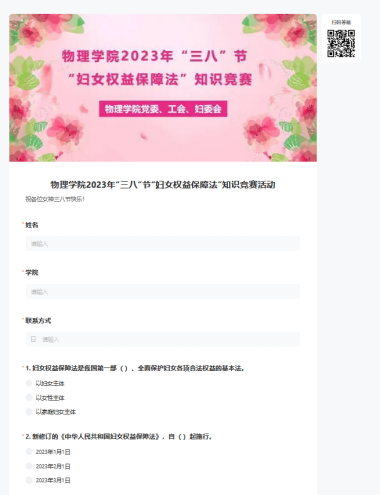 为了方便女教职工学习妇女权益保障法,学院制作了普法宣传手册,收录了《中国妇女发展纲要》、《中华人民共和国妇女权益保障法》、《女职工劳动保护特别规定》等内容,并制作了宣传海报。同时学院还开展了“妇女权益保障法”知识竞答,女教工们参与热情较高。因时间和场地限制,部分教师无法参加线下竞答活动,为此,学院设计了线上知识竞赛活动,提高了普法的普及率。