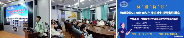 为帮助学生全面了解保研相关信息,提前作出更加明确的规划安排,进一步推动学院学生升学就业高质量发展,4月17日晚在学院321会议室组织召开2020级本科生升学就业规划指导讲座,本次邀请到中国科学院物理研究所研究生、学院2021届毕业生史雄飞分享推免经验暨中科院物理所宣讲,20级本科生辅导员荆鹏及30余名本科生参与本次活动。