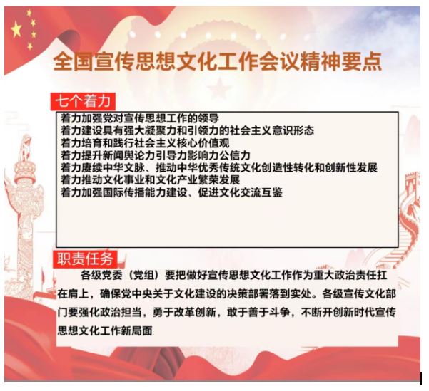 《会议精神要点展板》以全国宣传思想文化工作会议为出发点,对会议主要内容进行梳理:总结了新时代宣传思想文化工作取得的成就,提出了新的文化使命,强调七个着力,指出各级党委职责任务。展板内容丰富深刻,使全院师生更加全面了解到全国宣传思想文化工作会议的主要内容和精神,深刻领悟习近平文化思想。