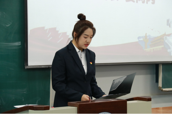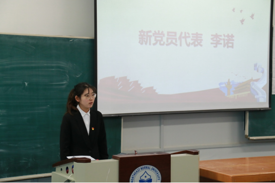 2021级本科生李诺和2022级研究生姜尚芮作为新发展党员代表发言,她们表示很荣幸能加入中国共产党,今后的路还很长,必将牢记初心和使命,做到“我将无我,不负人民”,不断追求思想、学习和工作上的更大进步,勇往直前。