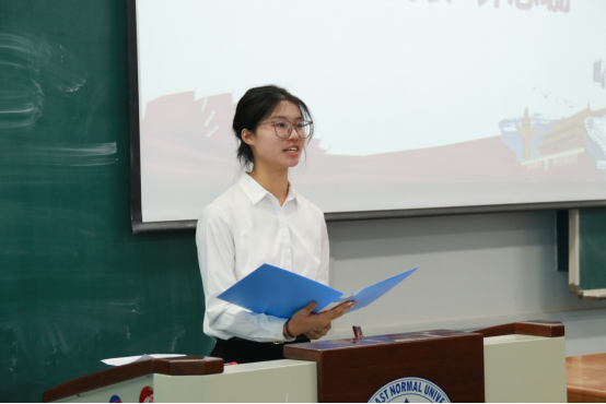 2022级本科生钟志堋作为积极分子代表发言,她代表全体入党积极分子表达了对新入党同志的祝贺,以及对党组织的向往,时代的接力棒在她们手中,她表示会更加严格要求自己,深入学习和贯彻落实习近平新时代中国特色社会主义思想,不断学习党的理论知识,领悟其精神内涵,在思想上与党保持高度一致,在行动上向党积极靠拢。