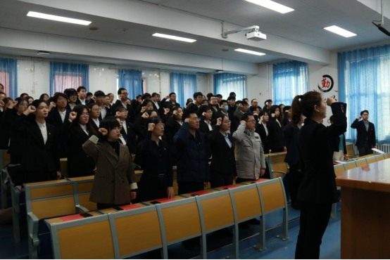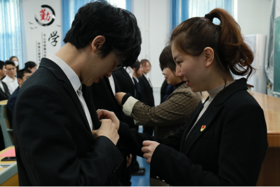 会议在雄壮的《国际歌》中拉开序幕,学院党组织员尹冬梅致辞并宣读预备党员名单,同意接收张宇欣等30名同志为预备党员。紧接着老党员为新党员佩戴党员徽章。在领誓人穆丽文的带领下全体党员面向党旗,举起右拳,庄严宣誓,铮铮誓言,拳拳红心,铿锵有力的话语表达了他们对党的深厚感情和为党的事业奋斗终身的决心。