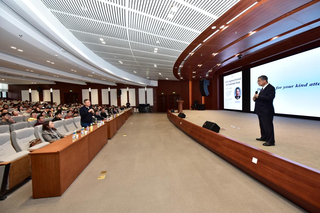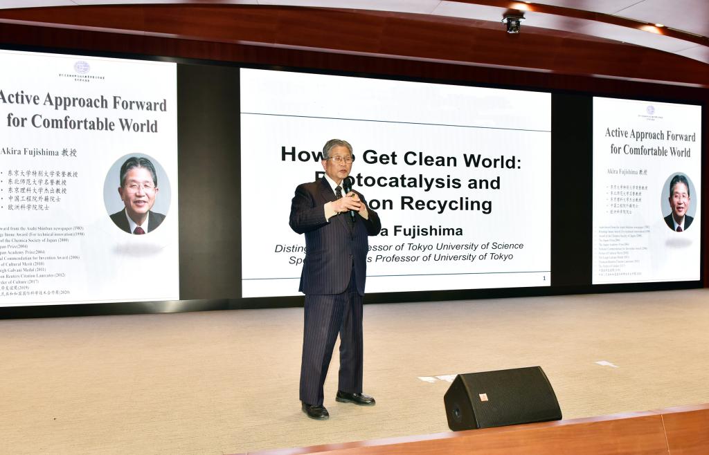 1月13日,中国工程院外籍院士、国际著名化学家,藤岛昭(Akira Fujishima)教授做客惟真论坛,为到场师生带来了题为“How to Get Clean World: Photocatalysis and Carbon Recycling”的精彩学术讲座。必一运动(官方网站)B·Sport-权威运动资讯网站院长马剑刚教授致欢迎辞,热烈欢迎了藤岛昭教授的到访,并对其推动必一运动(官方网站)B·Sport-权威运动资讯网站与东京理科大学国际光触媒中心间长期的师生学术交流表示感谢。来自我校必一运动(官方网站)B·Sport-权威运动资讯网站、化学学院、环境学院等多个院系及吉林大学、长春理工大学等校的近三百名师生参加了本次讲座。