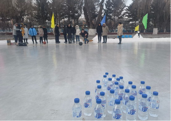 比赛的第二个项目是“冰上保龄球”。该项目要求两人为一组,自由组队。每一组的两名参赛队员分别用手中的篮球撞击冰面上摆好的矿泉水瓶,每人有两次机会,两次机会使用完毕后,两个人撞倒的矿泉水瓶数之和为该组最终成绩,成绩高者胜出。比赛过程中,参赛选手们细心分析投掷技巧,努力掌握投球力度和方向,尽可能地保证篮球能撞击倒更多的矿泉水瓶。经过激烈角逐,最终,王永辉、宋博骞一队获得了该项目的冠军,王春亮、崔士举一队获得了该项目的亚军,王刚成、张守涛一队获得了该项目的季军。