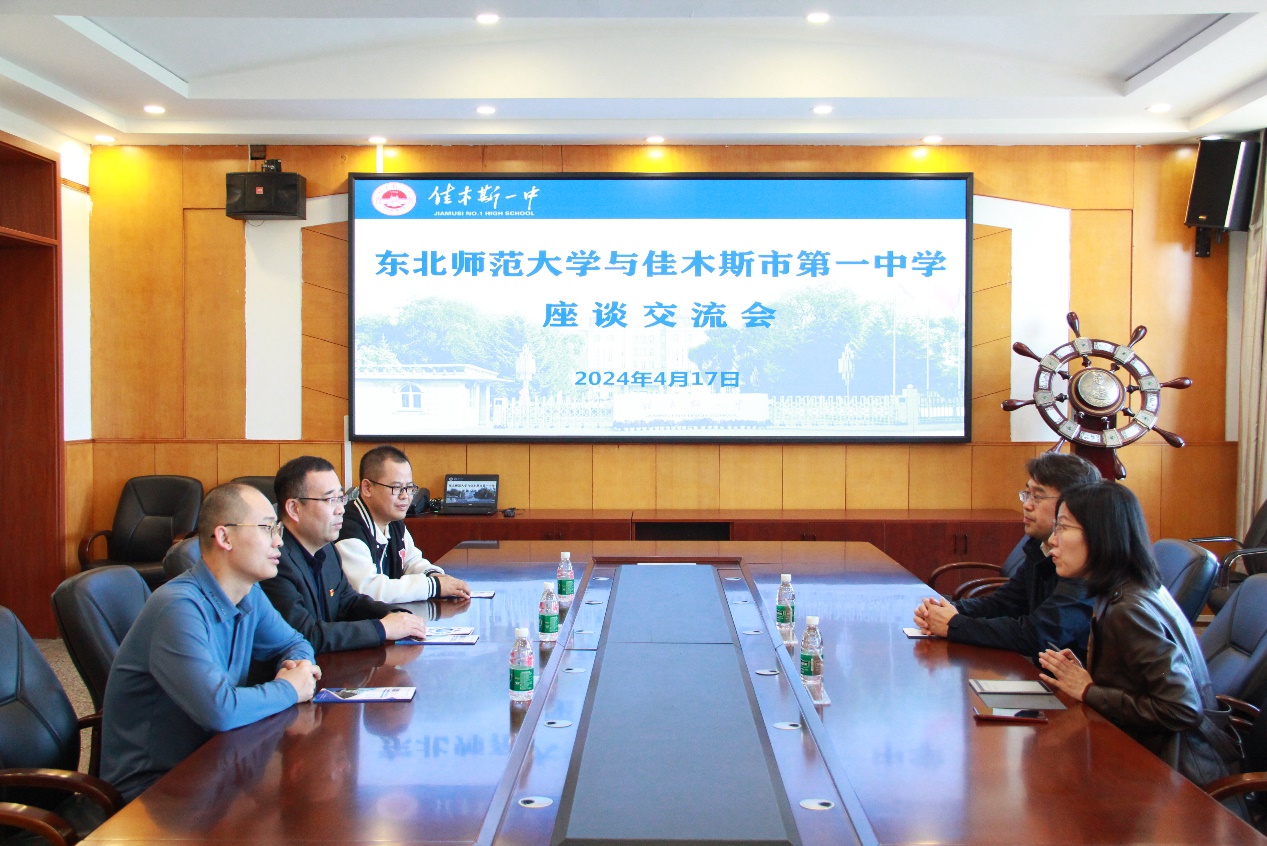 佳木斯市第一中学副校长任洪臣、教务处主任霍旺、教务处副主任肖兴龙参加本次座谈会。会上,佳木斯市第一中学副校长任洪臣对我校一行的到来表示热烈欢迎,随后从学校的发展沿革、创办理念、教学特色等情况予以介绍。任副校长表示未来要继续加强交流合作,协同育人发展。吉喆副书记对佳木斯一中向东北师范大学输送优秀毕业生给予了高度评价,并从东师的办学条件、办学特色、招生政策等情况进行介绍, 同时欢迎更多优秀学子报考我校。