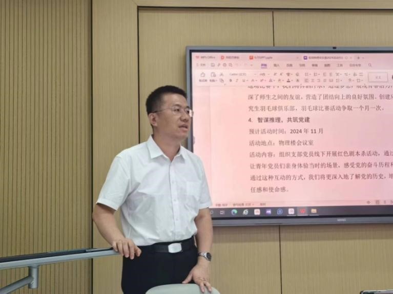 然后,其他党支部结合学院党委下发的“双创”建设标准等会议材料,依次进行发言。应用物理研究生党支部王佳男、材料和光学研究生党支部李莹莹、理论物理师生联合党支部沈宏志、本科生第三党支部穆丽文发言,他们介绍了目前党支部的情况,指出了存在的问题,并对标“样板支部”“百个研究生样板党支部”查找差距,阐述了下学期党支部建设的创新思路和丰富的活动计划。