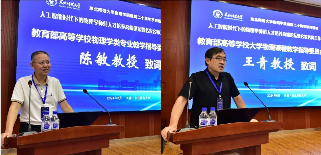 陈敏秘书长在致辞中,代表教育部物理学类专业教指委对东北师范大学及其会务教师和志愿者的精心筹备和辛勤工作表示诚挚感谢,并介绍了名家名师工作室成立背景与意义及其在师范人才培养中的重要作用。王青主任在致辞中代表教育部大学物理课程教指委对论坛的成功举办表示热烈祝贺,并高度评价了本次论坛的意义,期待论坛的研讨成果为我国物理学师范类人才培养工作注入新的动力。