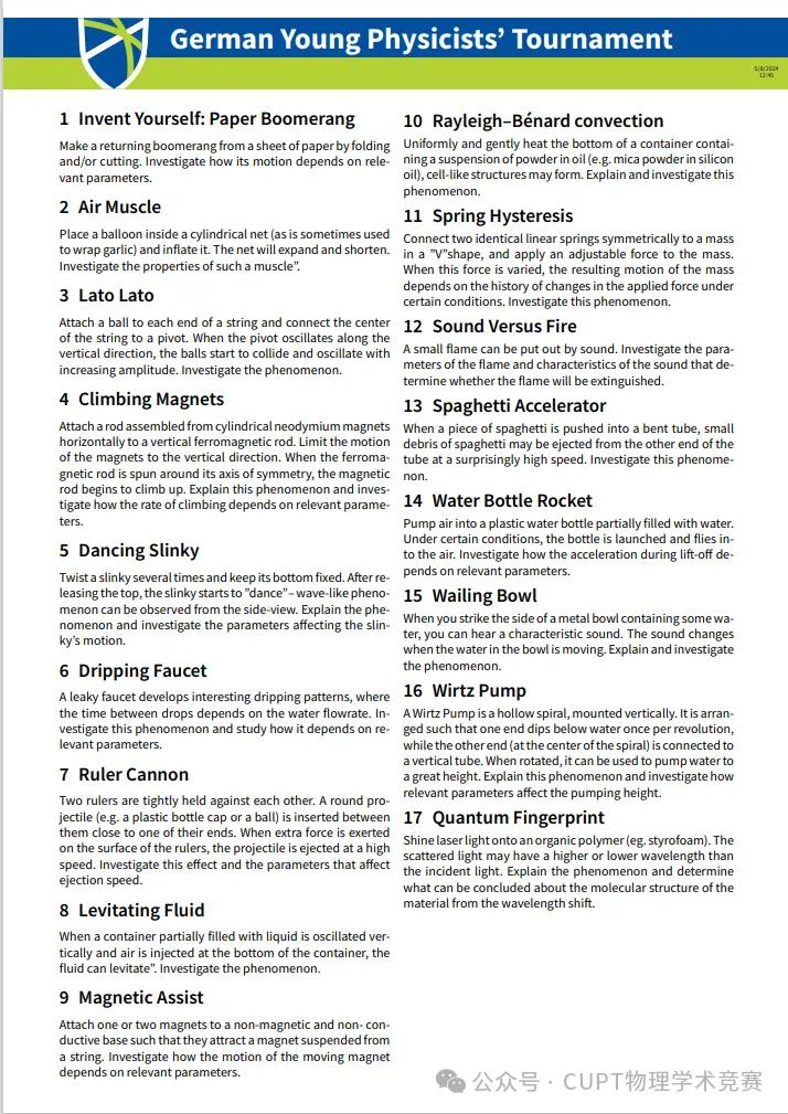 中国大学生物理学术竞赛(China Undergraduate Physics Tournament,简称CUPT)是一项团队对抗形式的物理竞赛,该项活动得到了教育部的支持,并被列入中国物理学会物理教学指导委员会的工作计划,是实践国家创新驱动发展战略纲要和国家教育中长期发展规划纲要的重要大学生创新竞赛活动之一。它以协同创新为根本理念,旨在提高学生综合运用所学知识分析解决实际物理问题的能力,培养学生的开放性思维能力。比赛题目新颖开放,部分源自《自然》、《科学》、《物理评论快报》、《现代物理评论》等顶级杂志。参赛学生就实际物理问题的基本知识、理论分析、实验研究、结果讨论等进行辩论性比赛。CUPT不仅培养了本科生的科研素质,而且还提升了创新意识、团队合作精神和交流表达能力,使学生的知识、能力和素质全面协调发展。