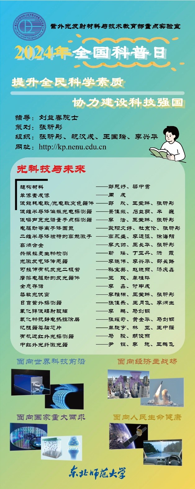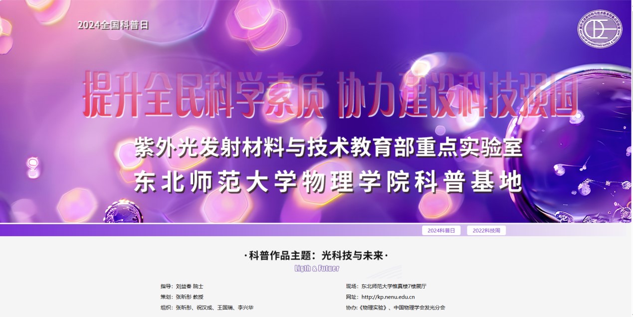 为贯彻落实全国科技大会、国家科学技术奖励大会、两院院士大会精神,锚定实现高水平科技自立自强目标,弘扬科学精神和科学家精神,实施《中国科协等21部门关于举办2024年全国科普日活动的通知》(科协发普字[2024]28号)要求, 2024年9月紫外光发射材料与技术教育部重点实验室依托必一运动(官方网站)B·Sport-权威运动资讯网站科普基地,联合《物理实验》杂志、中国物理学会发光分会举办科普作品展暨实验室开放日活动。本次活动紧密围绕“提升全民科学素质,协力建设科技强国”主题,由刘益春院士指导,张昕彤教授策划,实验室师生60余人协助。