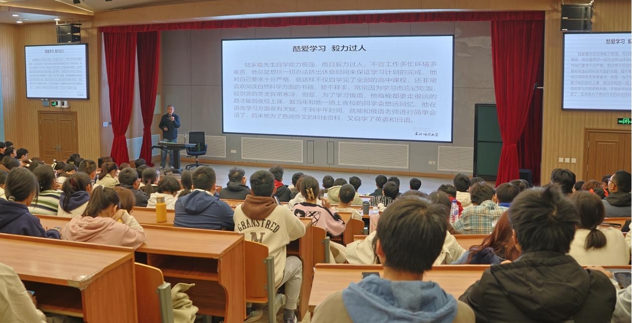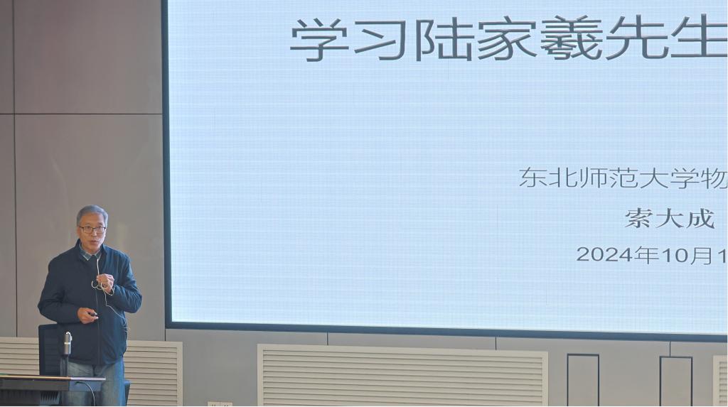 科学精神教育不仅是培养科技人才的基石,也是推动社会全面进步的重要力量。为了进一步弘扬科学精神,用身边事影响身边人,讲好“东师故事”,传递“东师声音”,2024 年 10 月 15 日晚,学院邀请离退休党支部支委索大成老师为2024级新生作题为“学习陆家羲先生的科学精神”主题报告,本次活动由辅导员刘雨婷主持,辅导员朱航松和2024级全体本科生200余人参会。