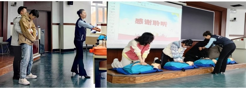 马钰铭老师结合生活实际,介绍了海姆立克急救法、创伤救护、心肺复苏术(胸部按压+人工呼吸)、AED的使用等内容。现场演示了止血、包扎、骨折固定应急操作及心肺复苏措施。同学们认真学习并积极参与实操,亲身体验,反复练习,掌握急救技能。