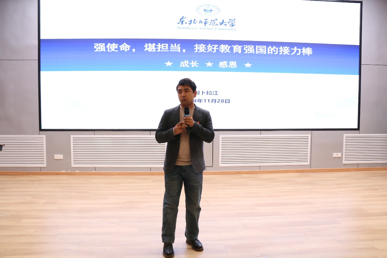 之后,阿卜老师论述了教育的重要性,并借我国抗战历史为例,强调了中国共产党的三个最:最伟大的党、最庞大的党、任务最艰巨的党。他向我们介绍了东北师范大学的历史背景,并表示:“人创造了环境,同样,环境也在创造着人。”阿卜老师期望同学们能够展现出作为东师学子应有的信念坚实、学识扎实、为人朴实、作风踏实的“四实”品格,为实现中华民族伟大复兴的中国梦贡献青春力量。
