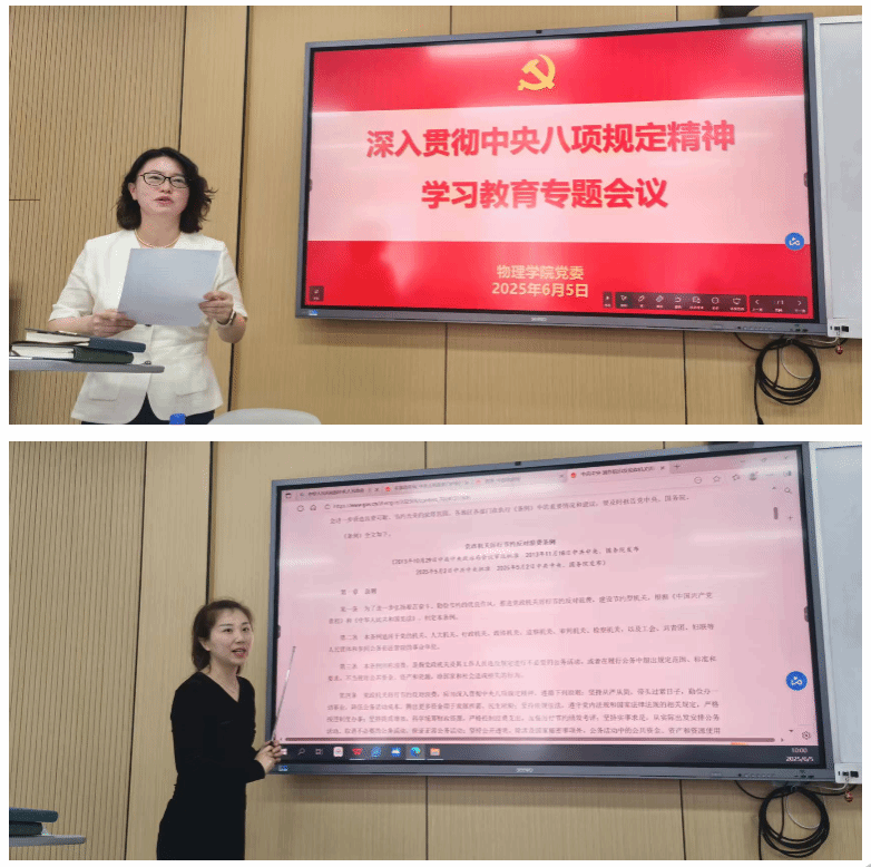 会上,臧丹首先全文传达了学校《关于深入贯彻学习中央八项规定精神的工作提示》,并结合学院实际逐条部署落实。学生党支部书记穆丽文按照学习要求,领学了《党政机关厉行节约反对浪费条例》,重点解读了“经费管理”“公务接待”“办公用房”“资源节约”等核心章节的具体要求。随后,她以河北省三河市在城市管理中违反中央八项规定精神、侵害群众利益问题的典型案例为例,强化党员干部的纪律意识与宗旨意识。臧丹在总结时强调,案例是最好的教科书,也是最好的清醒剂。党员干部要以案为戒、反躬自省,把《条例》要求内化为政治自觉、外化为行动准则。