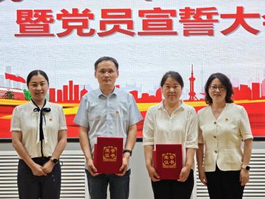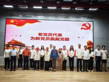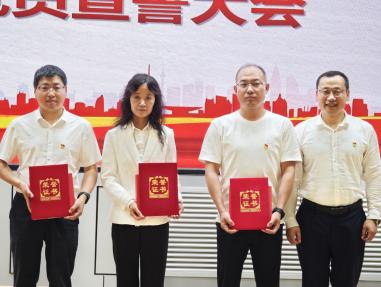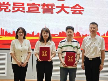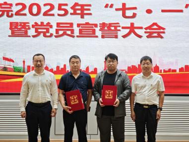 表彰结束后,老党员代表周辉、陆国庆、李凤华、索大成、韩维彬、白金昌、夏彬、于海波、梁士利为新党员代表佩戴党的徽章,一枚枚鲜红的党徽承载着使命与责任,象征着红色基因的薪火相传。随后,全体党员在副院长黄继鹏的带领下,举起右拳庄严宣誓,铿锵有力的誓言回荡在会场,彰显了全体党员不忘初心、牢记使命的坚定信念。