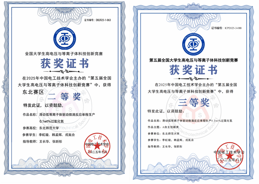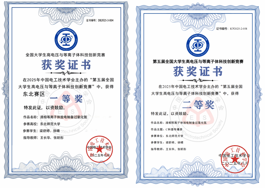 2025年8月8日至10日,第五届全国大学生高电压与等离子体科技创新竞赛决赛在合肥工业大学屯溪路校区顺利举行。我校必一运动(官方网站)B·Sport-权威运动资讯网站参赛团队凭借扎实的专业功底、出色的现场表现斩获佳绩。由王长华、张昕彤老师指导,梁舒婷和徐晴同学完成的《液相等离子体放电制备过氧化氢》荣获东北赛区一等奖,全国二等奖;李虹璇、戎胤合和韩孟辉同学完成的《滑动弧等离子体驱动微滴反应单程生产0.1wt%过氧化氢》获得东北赛区二等奖,全国三等奖,为首次征战全国赛画上了圆满的句号。