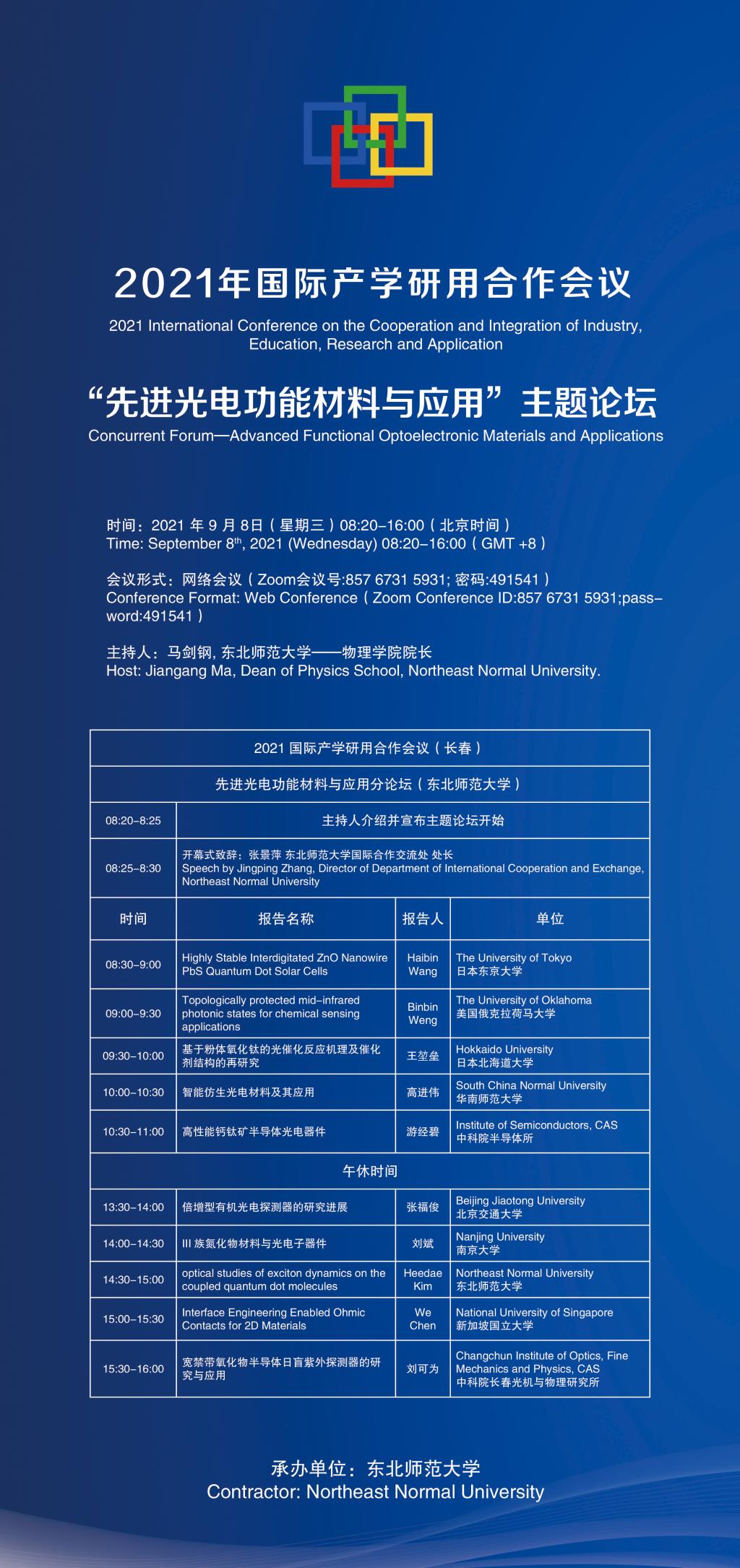 为了配合国际产学研用合作会议(长春站)召开,必一运动(官方网站)B·Sport-权威运动资讯网站承办了“先进光电功能材料与应用”主题论坛,本次会议采用线上和线下混合的方式进行,共计邀请了10位来自国内外的知名专家和学者,通过云端分享他们在先进光电功能材料与应用领域的最新研究成果。