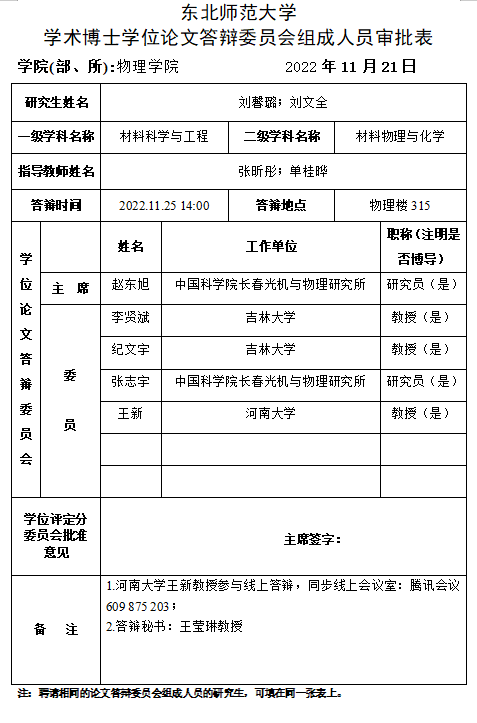 刘馨璐、刘文全学术博士学位论文答辩委员会组成人员审批表